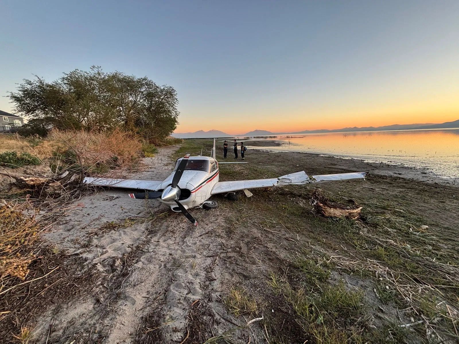 A small single-engine plane made an emergency landing along the shoreline in Vineyard after suffering engine trouble on the way to Provo Airport. Thankfully, the pilot and one passenger escaped uninjured. Photos show the plane sustained damage — one wing bent, landing gear collapsed, and it reportedly struck a tree stump during the landing.